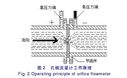 孔板流量計(jì)是差壓式流量計(jì),它是由一次檢測(cè)件(節(jié)流件)和二次裝置(差壓變送器和流量顯示儀)組成。當(dāng)被測(cè)介質(zhì)通過節(jié)流件時(shí)局部產(chǎn)生收縮,流速增加,在節(jié)流件后面產(chǎn)生靜壓力,由此在節(jié)流件前后產(chǎn)生了壓差,而此壓差隨流量的變化而變化,流量大則壓差就大。作為二次裝置的差壓變送器測(cè)量節(jié)流件前后的壓差,計(jì)算出對(duì)應(yīng)的流量值孔板流量計(jì)工作原理見圖2