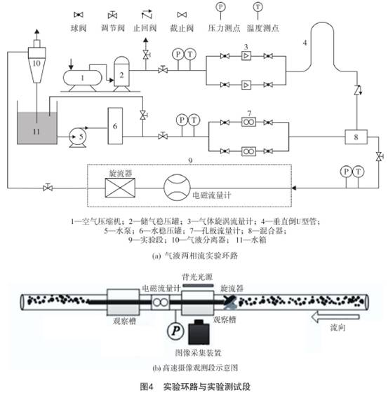 實(shí)驗(yàn)在空氣-水兩相流實(shí)驗(yàn)回路中進(jìn)行,以驗(yàn)證所提出的測(cè)量方法的可行性。實(shí)驗(yàn)環(huán)路及實(shí)驗(yàn)段布置如圖4所示,在實(shí)驗(yàn)段安裝了旋流器和電磁流量計(jì)。