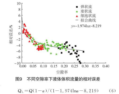 圖9顯示了不同空隙率流量測(cè)量的相對(duì)誤差。由圖9可以看出,測(cè)量誤差隨著空隙率增加而增加,且具有很強(qiáng)的規(guī)律性。導(dǎo)致這種現(xiàn)象的原因可能是因?yàn)榕c單相流相比,旋轉(zhuǎn)環(huán)狀流中存在不導(dǎo)電氣芯,使導(dǎo)電相流通截面發(fā)生改變,由單相流中的圓形變?yōu)閮上嗔髦械沫h(huán)形,造成儀表常數(shù)發(fā)生改變。由圖9還可看出,通過(guò)關(guān)于截面相含率的校正,可得到更精確的測(cè)量值計(jì)算式如下: