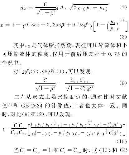 2624中給出的文丘里或噴嘴的可壓縮系數(shù)是一致的,這也是合理的,因為在文丘里或噴嘴結構下,可以認為流體的最小流通面積即為喉徑的面積,即C≈l。對孔板而言,C.與C..的比值隨孔板前后壓差變大而變大,因此孔板的可壓縮系數(shù)大于文丘里或噴嘴的可壓縮系數(shù),這和式(8)的計算結果是一致的。